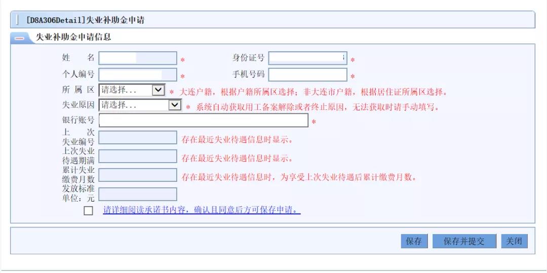 步驟四:點(diǎn)擊失業(yè)補(bǔ)助金申請(qǐng)模塊,系統(tǒng)自動(dòng)獲取社會(huì)保障卡號(hào),錄入個(gè)人基本信息(填報(bào)信息里帶*號(hào)的必填,不帶*號(hào)的不用填),簽訂申領(lǐng)失業(yè)補(bǔ)助金承諾書,在確認(rèn)無(wú)誤后按“保存并提交” 鈕上傳申領(lǐng)數(shù)據(jù)。如持有承載失業(yè)保險(xiǎn)待遇發(fā)放的八家銀行(工商銀行、農(nóng)業(yè)銀行、中國(guó)銀行、建設(shè)銀行、交通銀行、大連銀行、郵政儲(chǔ)蓄銀行、農(nóng)商銀行)的社會(huì)保障卡,需先到社?òl(fā)卡銀行開通社?ń鹑诠δ(開通后五個(gè)工作日后再申請(qǐng)),確保正常領(lǐng)取失業(yè)補(bǔ)助金待遇。如持有其他銀行的社保卡則需錄入大連銀行卡號(hào)申領(lǐng)。
